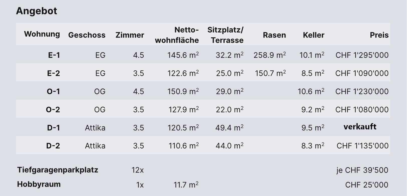 Bei unseren Wohnungsangeboten legen wir Wert auf vollständige und verständliche Informationen. Sämtliche Nettowohnflächen sind klar ausgewiesen – zusätzliche Räume wie Keller, Sitzplatz oder Terrasse sind bewusst nicht in die Nettowohnfläche eingerechnet, damit Sie genau wissen, wie viel Platz Ihnen im Alltag tatsächlich zur Verfügung steht.